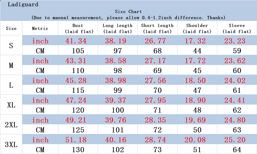 Size: 3XL, Bust: 130cm/51.2", Length: 102cm/40.2", Sleeve: 62.5cm/24.6", Shoulder: 54cm/21.3" (Approx.)
